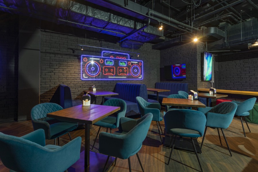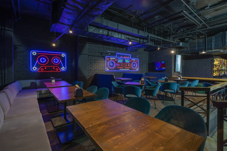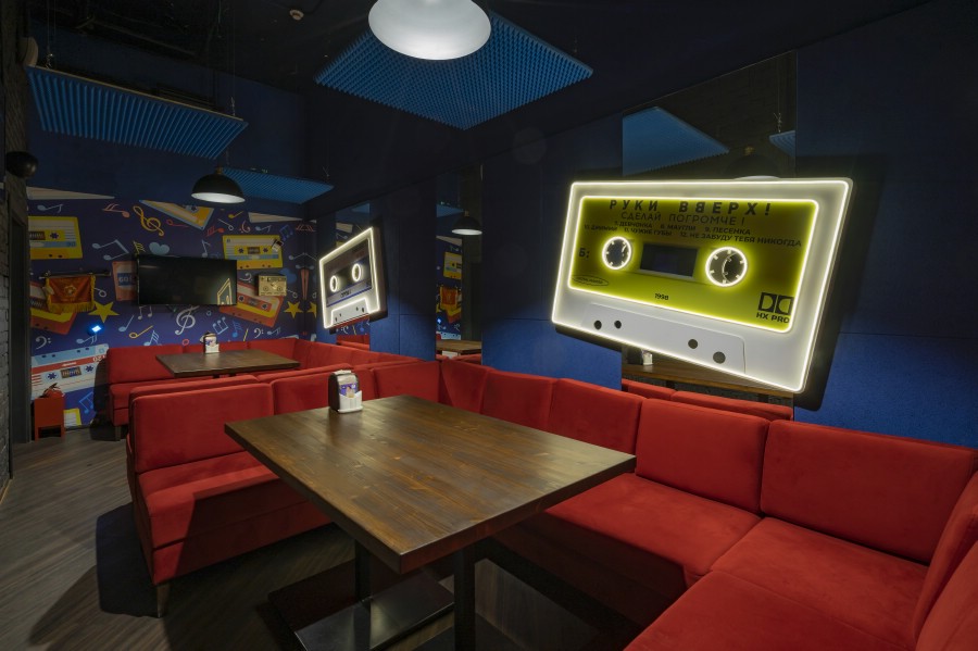 - Караоке-зал. Комната изолирована от других гостей. Люди чувствуют себя свободно, могут петь, разговаривать, не мешая другим. В помещении установлены отдельные столы, оборудование, микрофоны. Всё работает без сбоев.